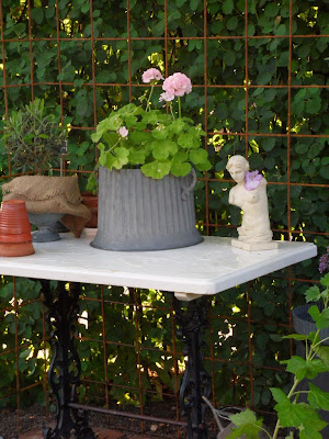 Så herlig hagebilde! Nydelig med det grønne bladverket i bakgrunnen. Flott med bordet og pelargoniaen også. Herlig tid i møte!